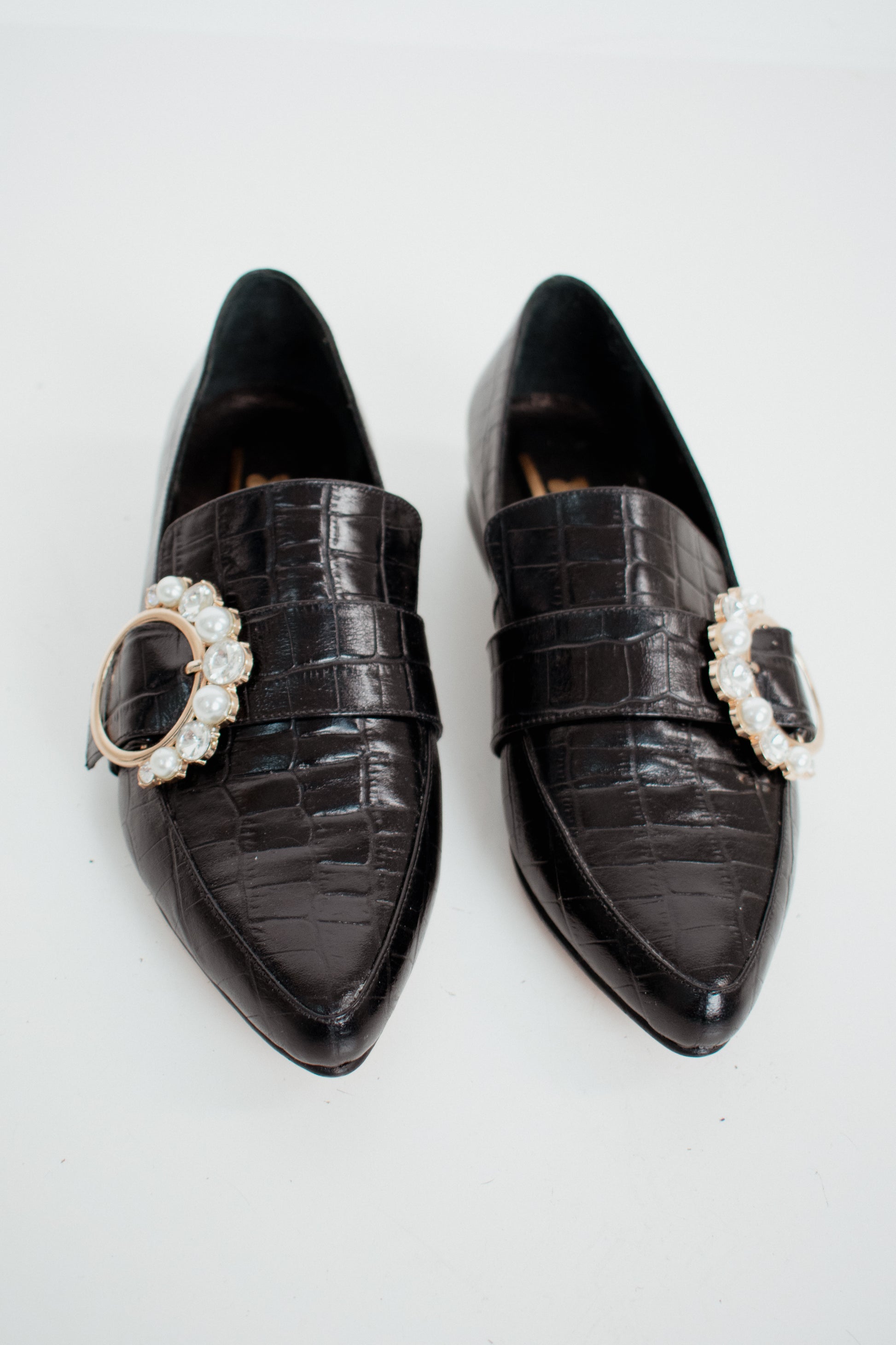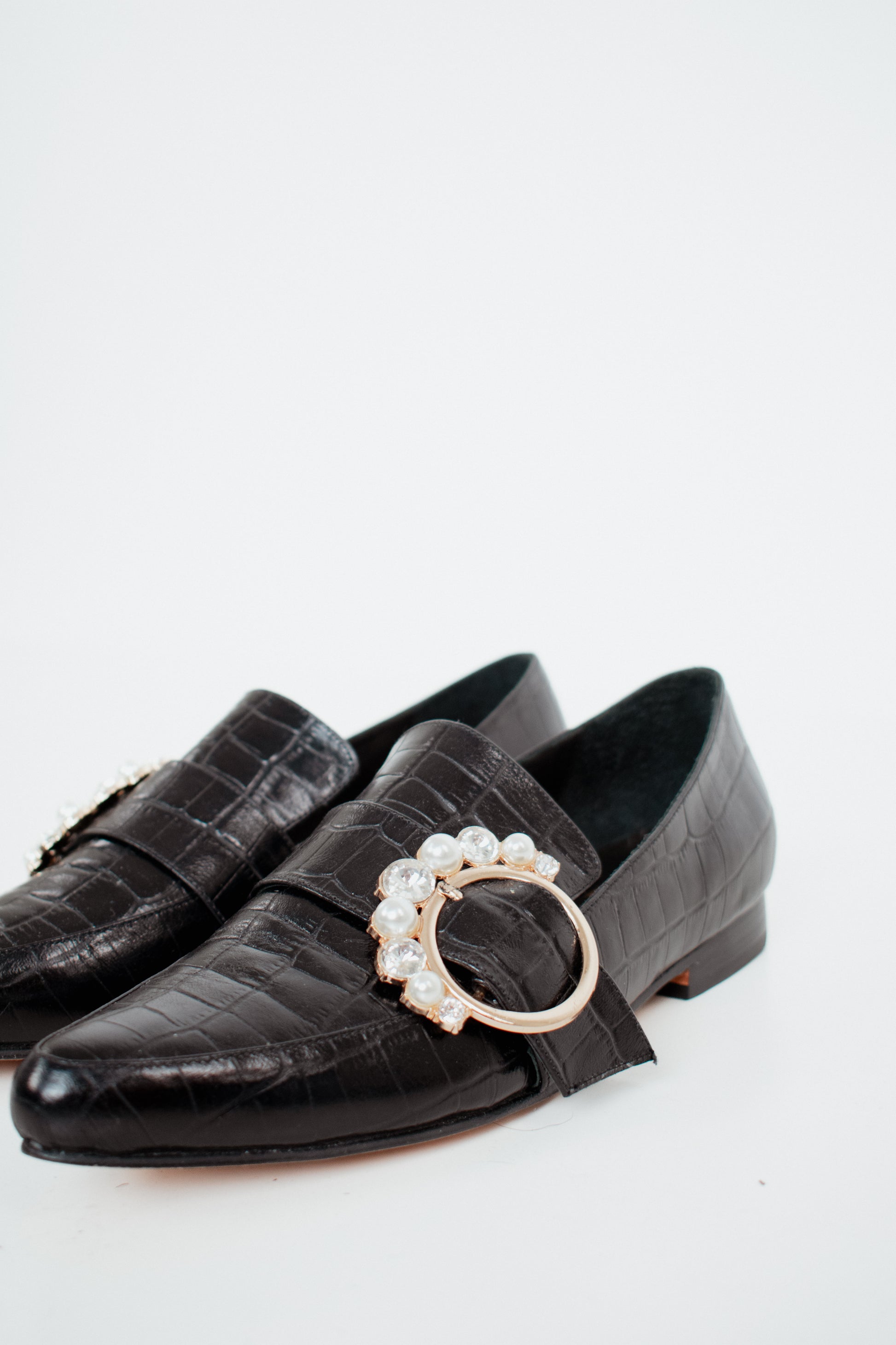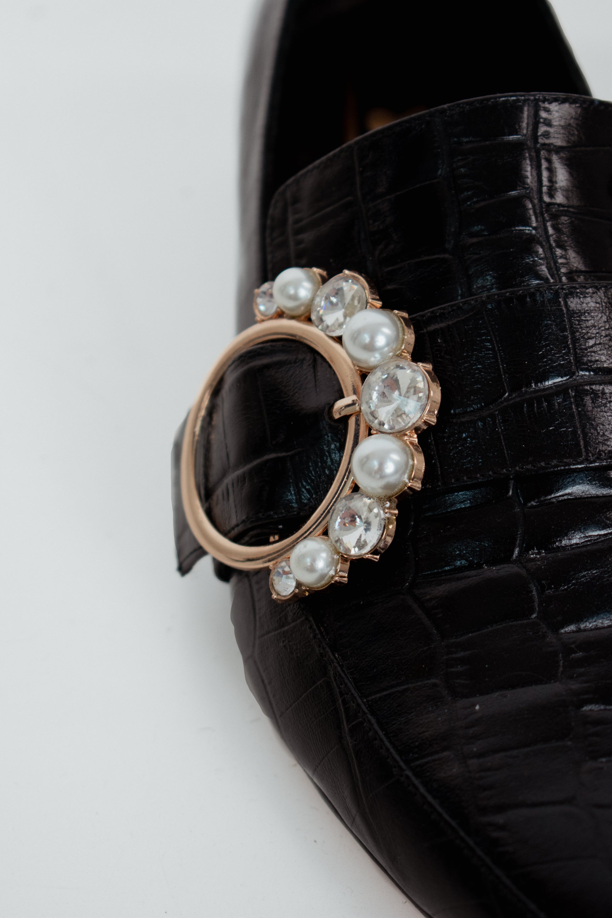 Mocasín hecho en Argentina en 100% cuero con textura cocodrilo, que combina elegancia y un toque contemporáneo. Presenta un adorno de hebilla dorada decorada con perlas blancas pequeñas, aportando un detalle sofisticado y femenino. Su diseño atemporal y versátil lo convierte en el complemento ideal para looks de oficina, eventos o conjuntos casual chic.