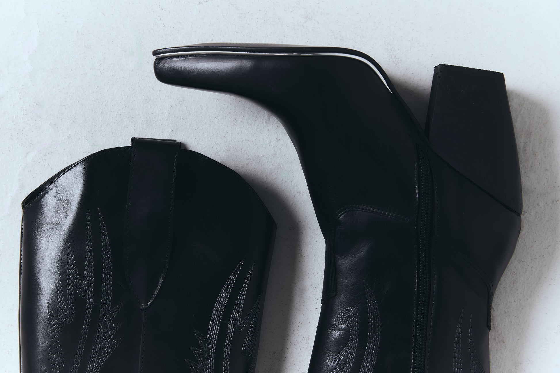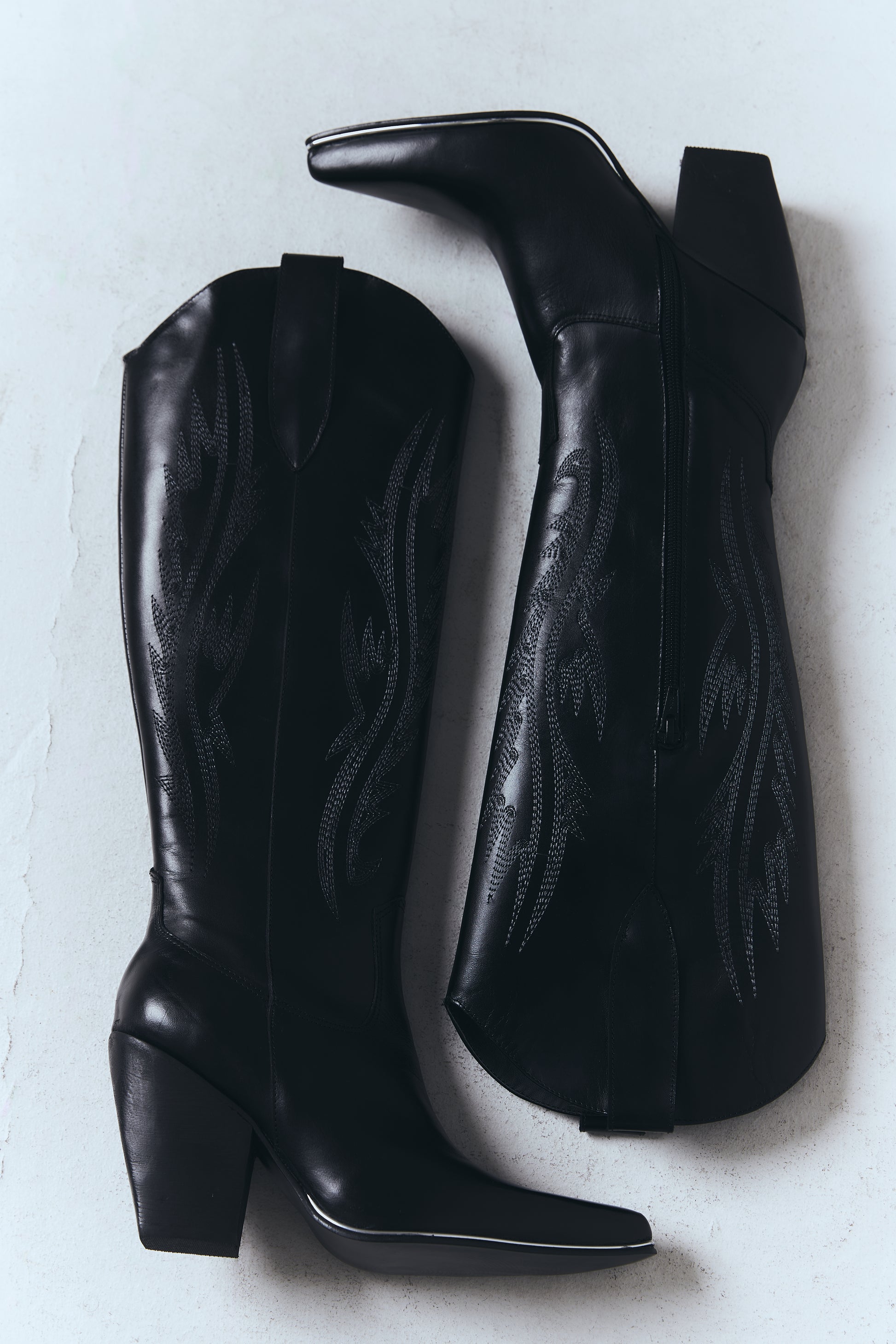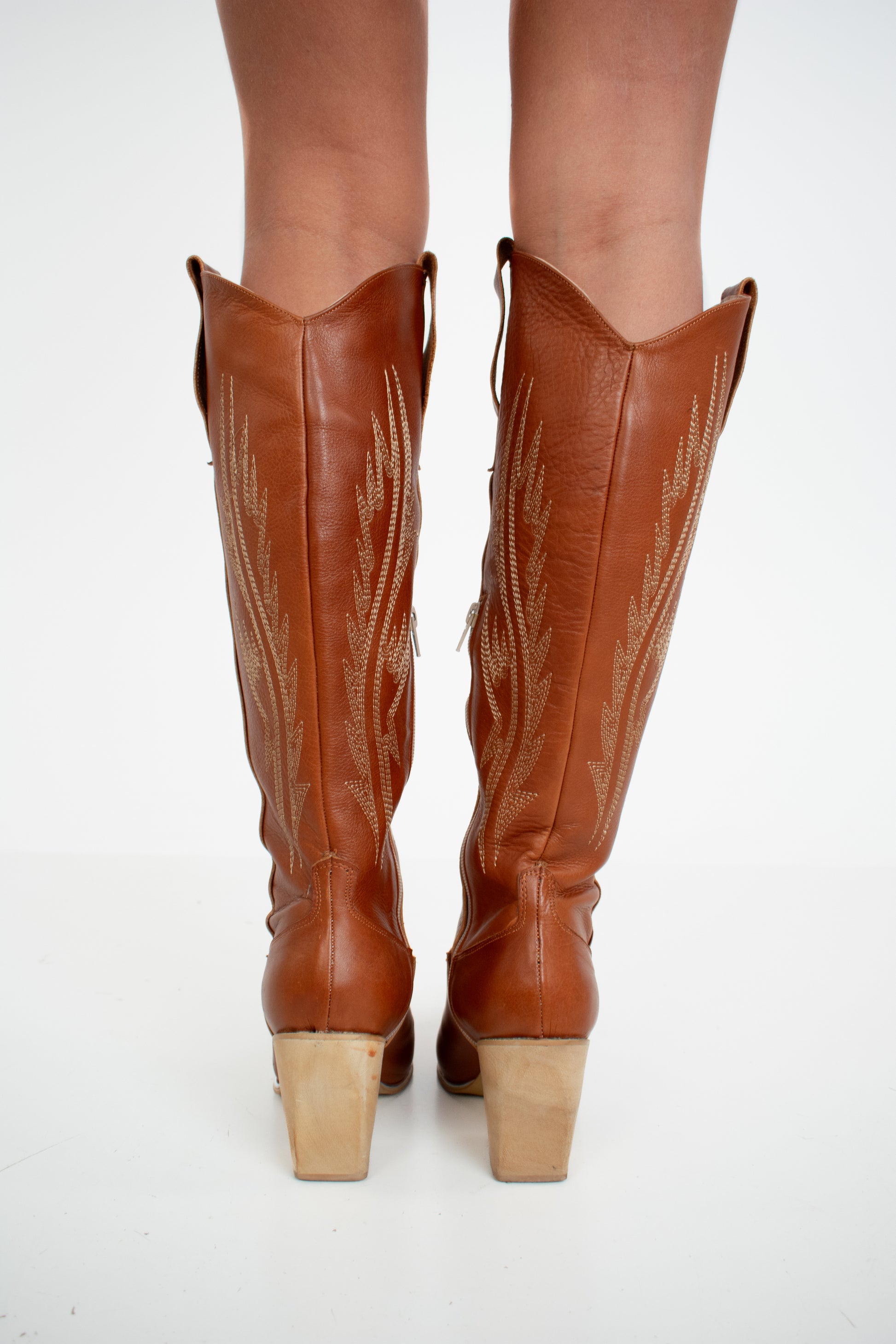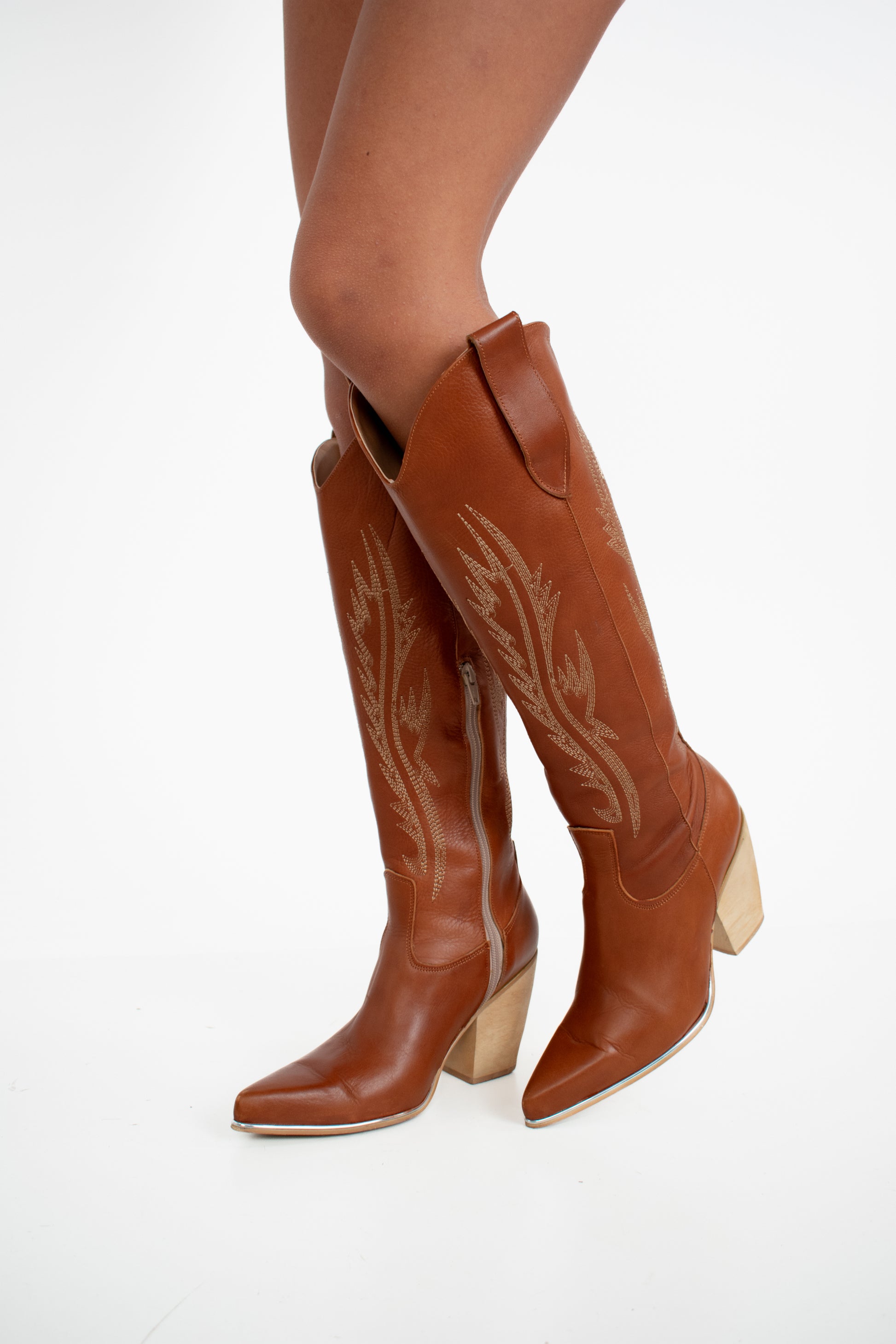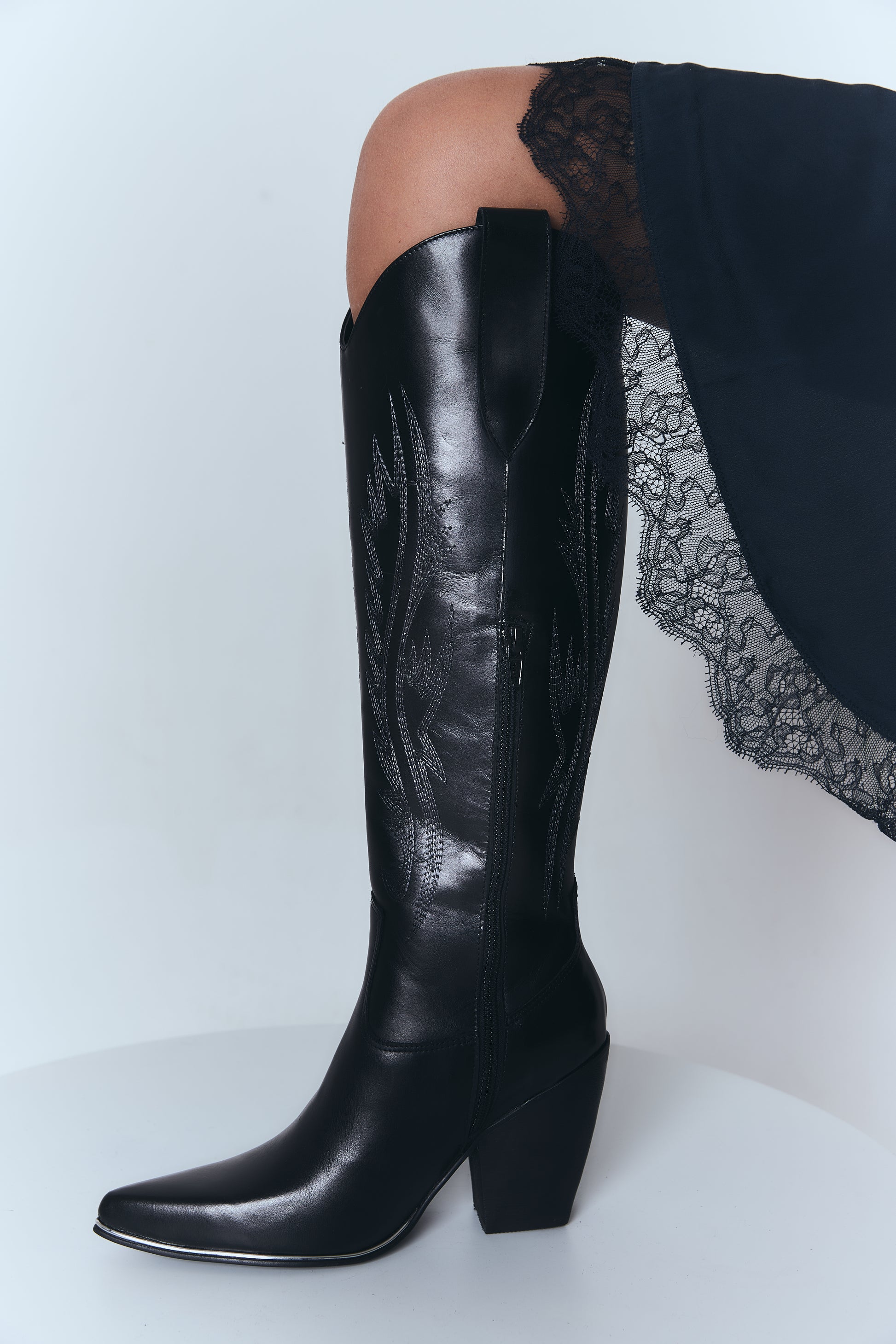 Bota de caña alta en 100% cuero vacuno, disponible en black y camel. Con una altura de caña de 45 cm, taco de 10 cm y plataforma de 0,5 cm, combina una silueta estilizada con un toque western elegante. Confección 100% artesanal, pensada para un calce firme y cómodo a pesar de su altura. Perfecta para looks de impacto, desde vestidos boho hasta jeans skinny, aportando altura y estilo en cualquier ocasión.
