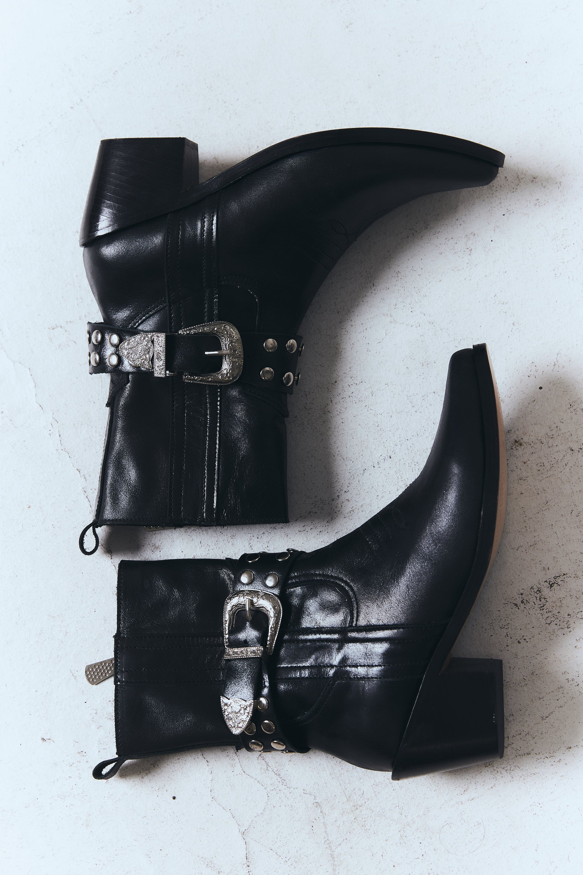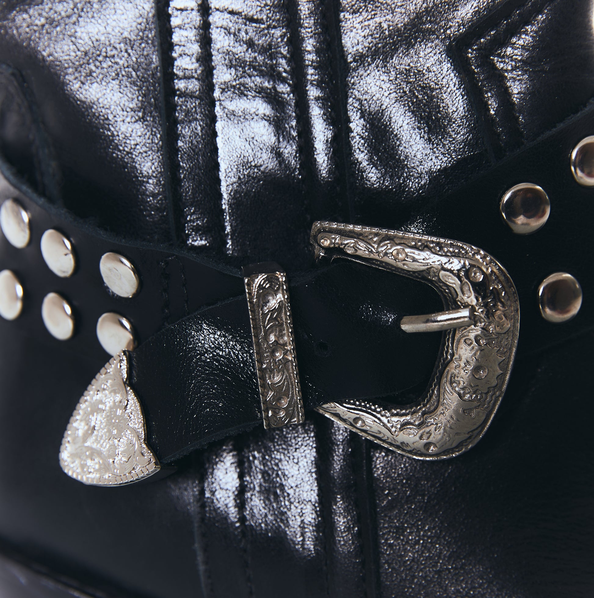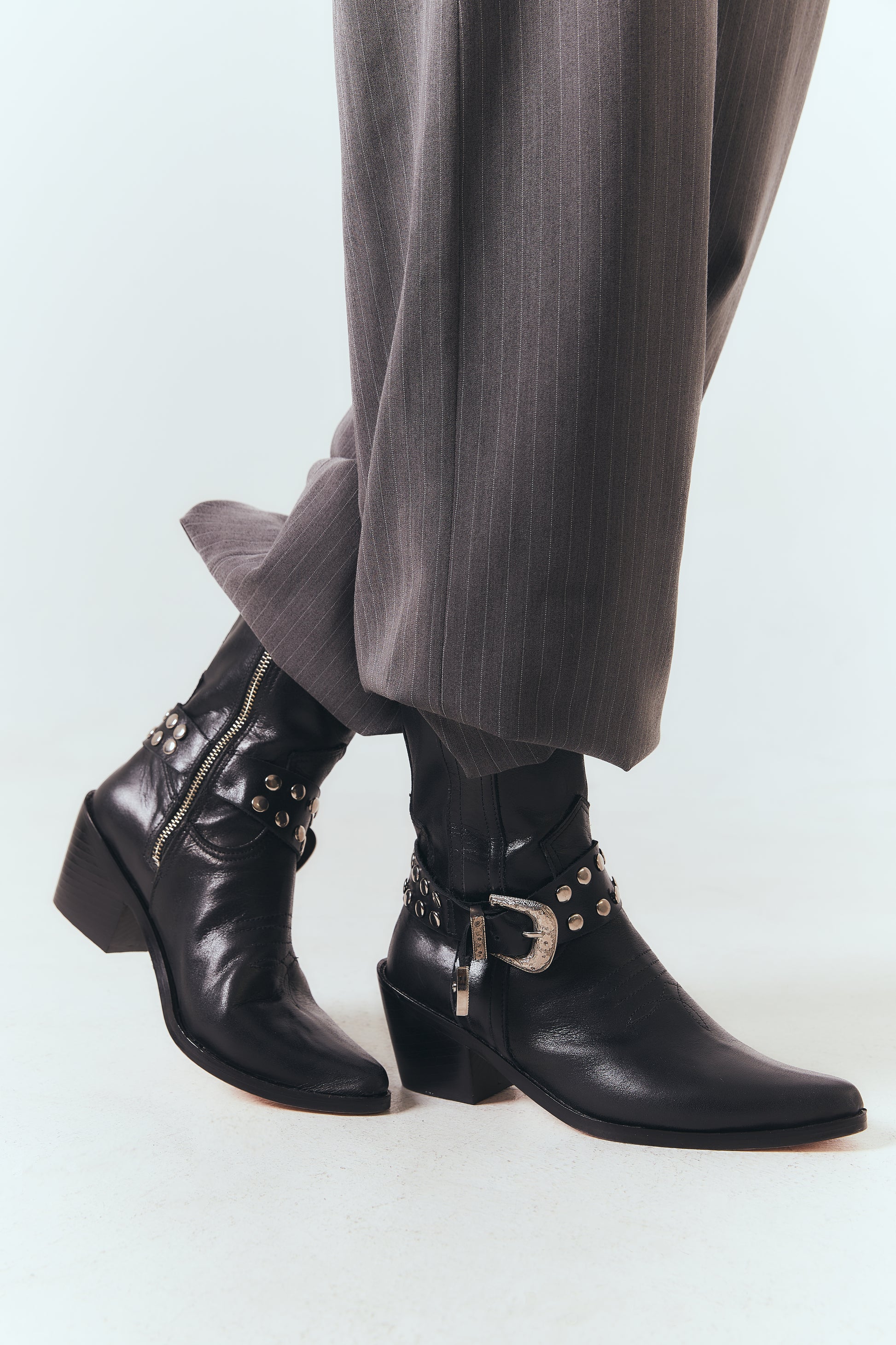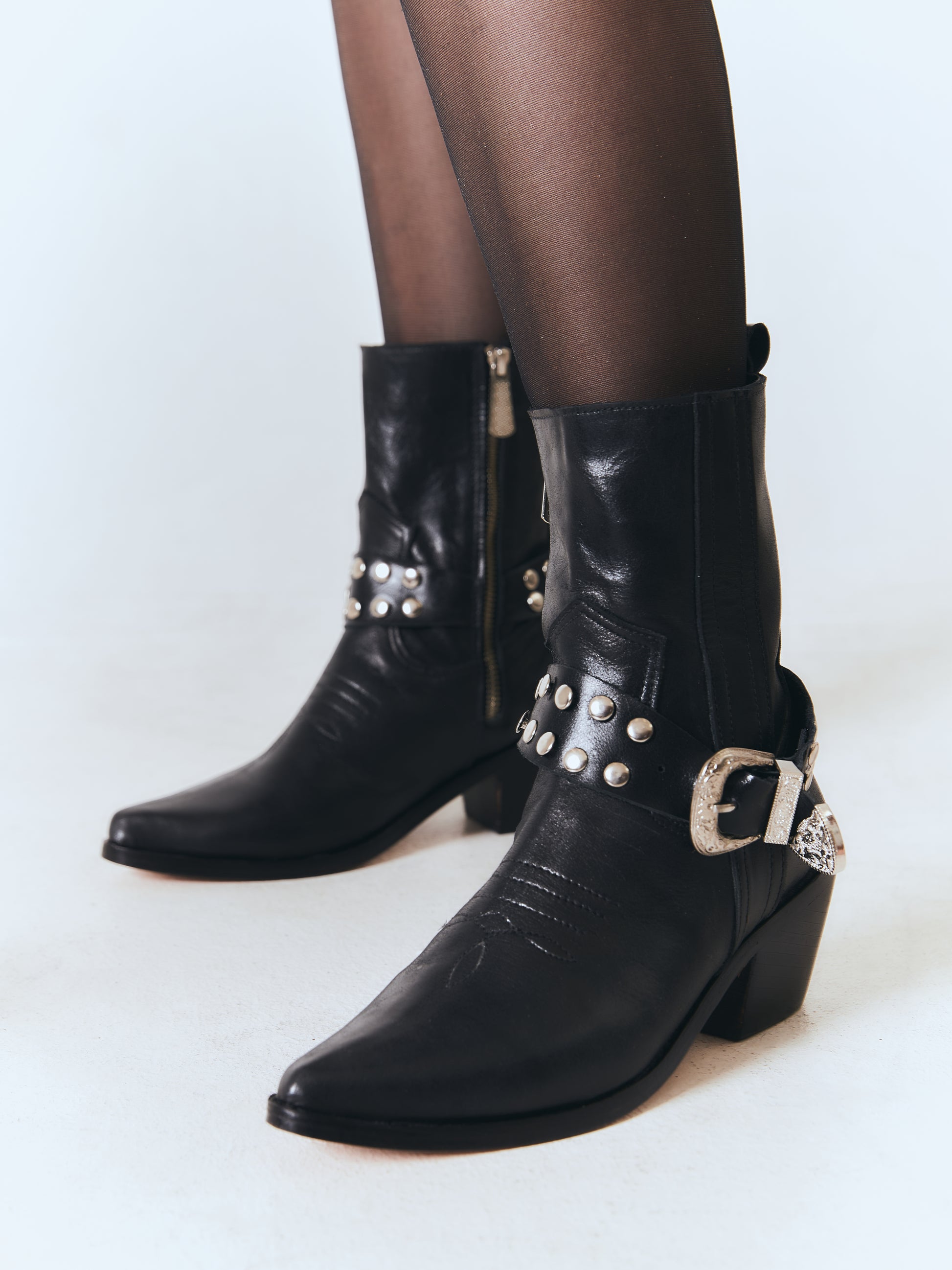 Bota de media caña en 100% cuero vacuno chileno, con diseño western contemporáneo. Incorpora costuras decorativas, hebillas metálicas con grabado, cierres laterales de diseño y tachas en baño de níquel que le dan carácter y personalidad. Confección 100% artesanal, cuidando cada detalle. Su taco de 4,5 cm entrega la altura perfecta para un look cómodo pero estilizado. Ideal para combinar con jeans, vestidos o faldas y llevar un toque de actitud a cualquier outfit.